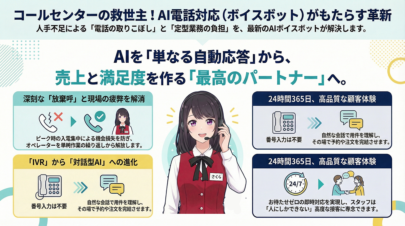 AI電話対応(ボイスボット)は、従来のIVRが抱えていた「顧客のストレス」と「完結しない業務」という弱点を克服した最新のソリューションです。定型業務の自動化によって放棄呼を減らし、現場スタッフを疲弊から解放することで、真に価値のある接客業務へとシフトすることが可能になります。