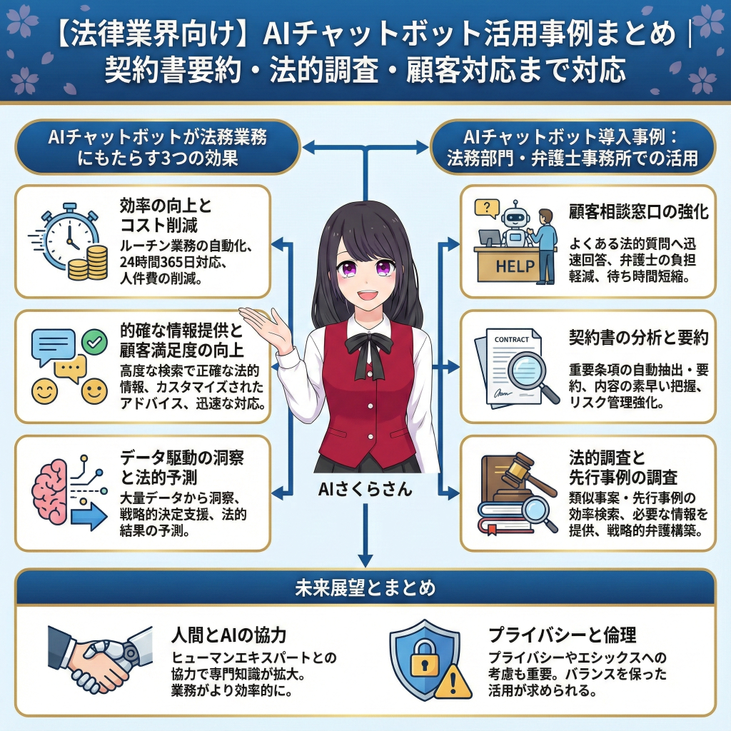 AIチャットボットの導入により、法律業界では業務効率の向上や顧客満足度の向上が期待され、顧客相談窓口の強化や契約書の分析、法的調査において効果的に活用されています。将来的には、ヒューマンエキスパートとの協力により専門知識が拡大し、業務がより効率的になる可能性があります。