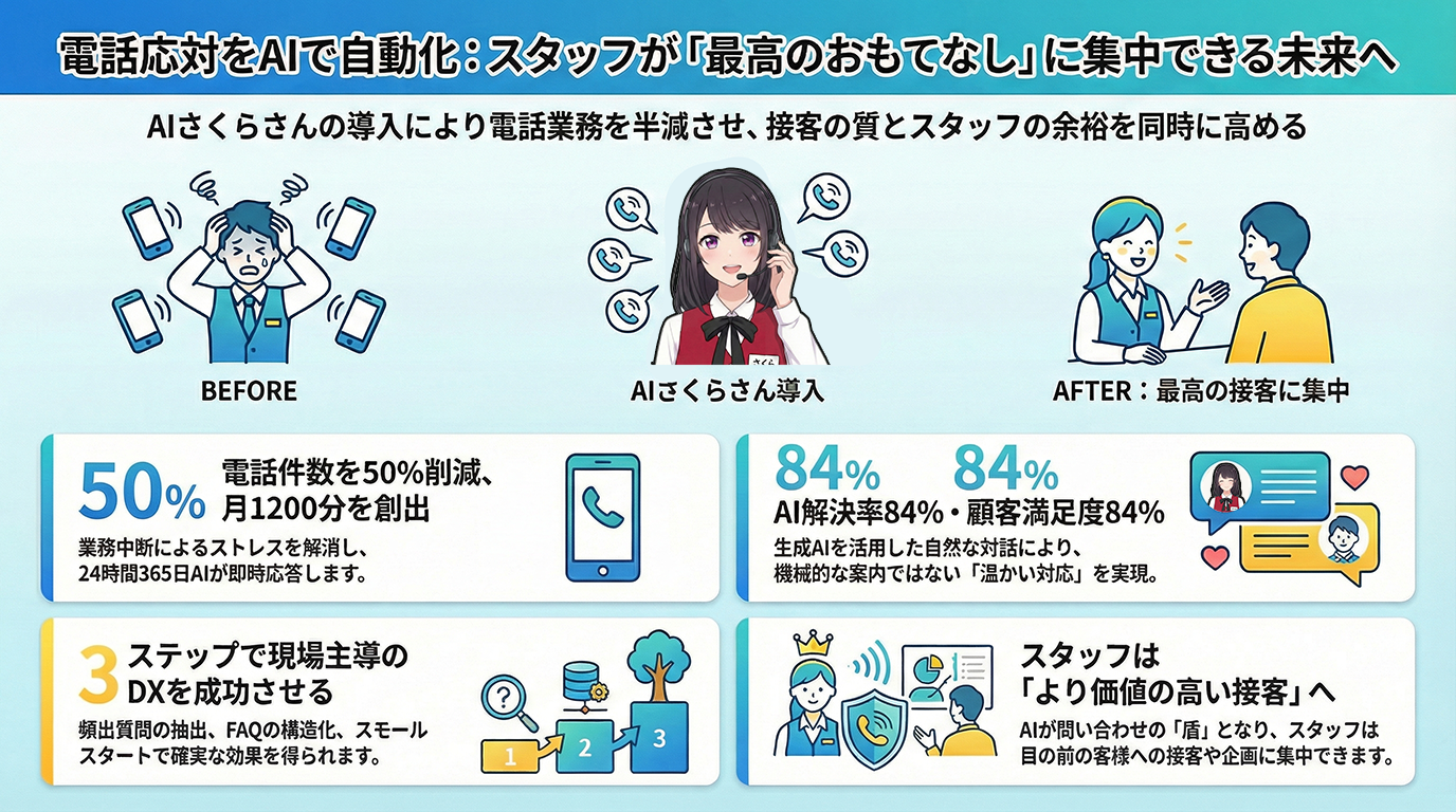 多くの現場マネージャーが抱えるのは、「スタッフをより価値の高いおもてなしに集中させたい」という願いです。しかし、24時間体制の運営や季節ごとのイベント対応など、電話業務を物理的に減らすことは困難でした。