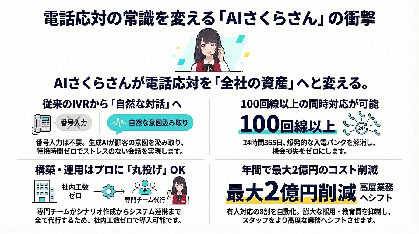 最新のAI電話対応の中でも、「AIさくらさん」は上記の選定基準において、特に「構築・運用の完全代行(フルサポート)」という点で独自の強みを備えています。
