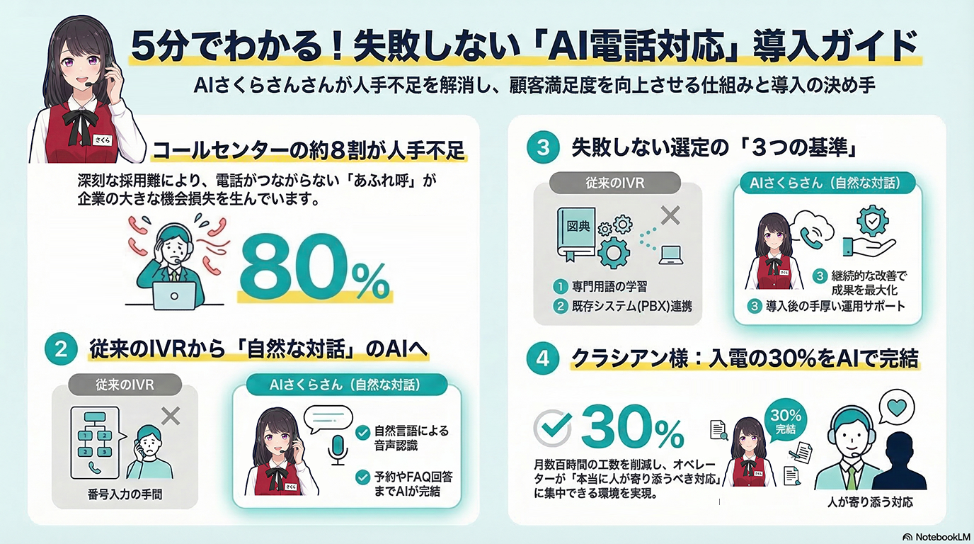 AI電話対応システムは、もはや単なるコスト削減ツールではなく、顧客の時間を奪わず、同時にスタッフの負担を軽減するための戦略的投資です。クラシアン様の事例が示す通り、自社の課題に合ったAIソリューションと適切な運用サポートを組み合わせることで、CX(顧客体験)とEX(従業員体験)を同時に高めることが可能です。