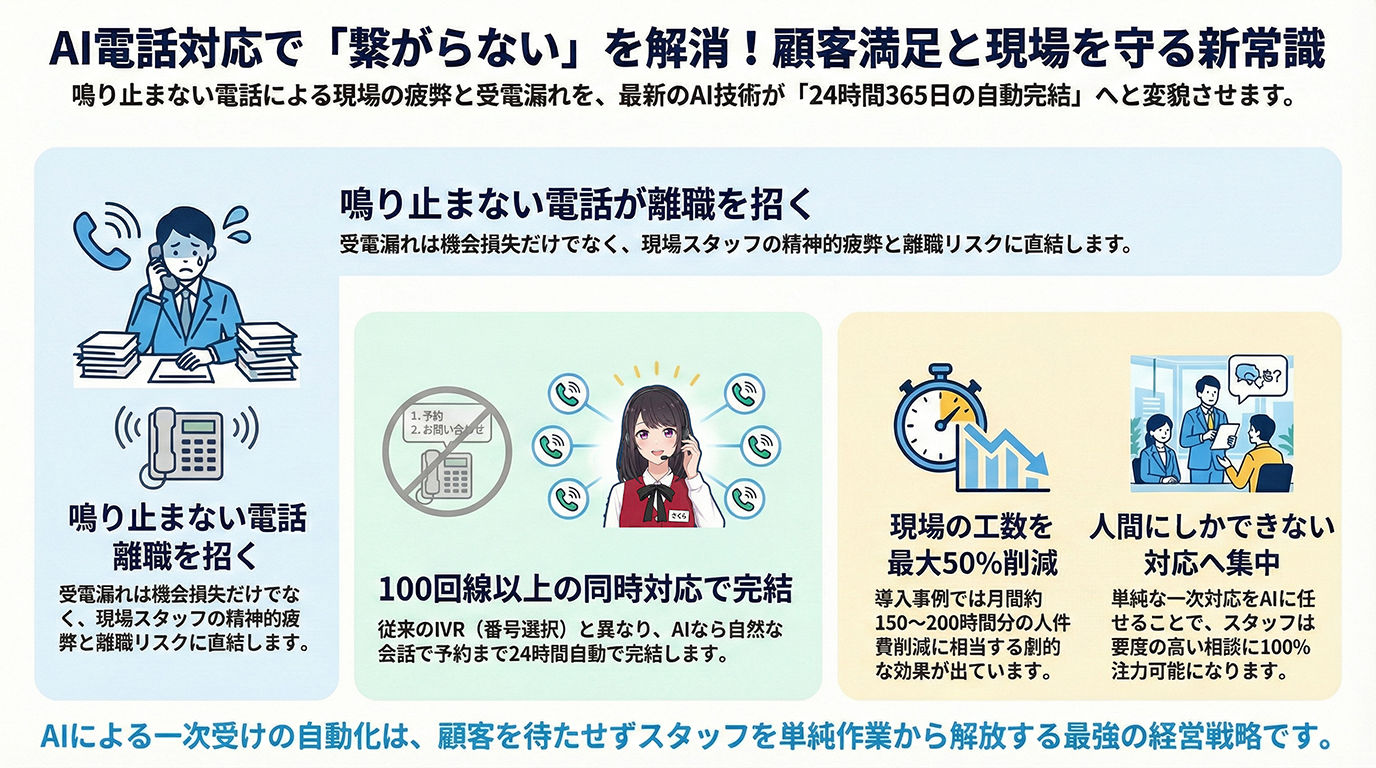 特に問い合わせが集中する「ピークタイム」には、物理的に人間が対応できる限界を超えた「あふれ呼(受電漏れ)」が発生します。これは単なる機会損失に留まりません。鳴り続ける電話は現場スタッフの集中力を分断し、ミスを誘発し、精神的な疲弊(離職リスク)に直結します。「電話を待たせている」という罪悪感と「目の前の作業が終わらない」という焦燥感の板挟み――この現場のジレンマを解消するのが、AI電話対応による一次受けの自動化です。