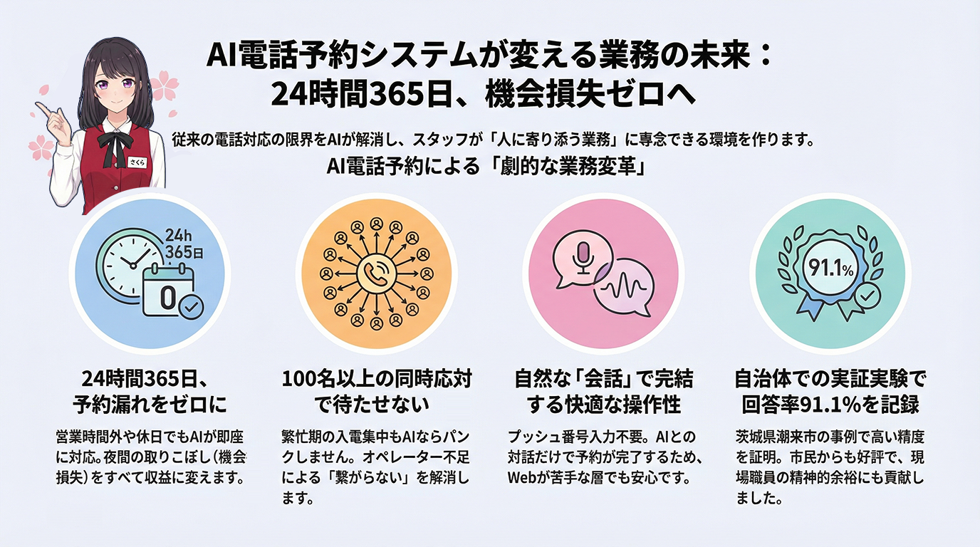電話予約システムは、AIによる24時間自動応対で予約漏れをゼロにし、Web操作が苦手な層の利便性を最大化するソリューションです。