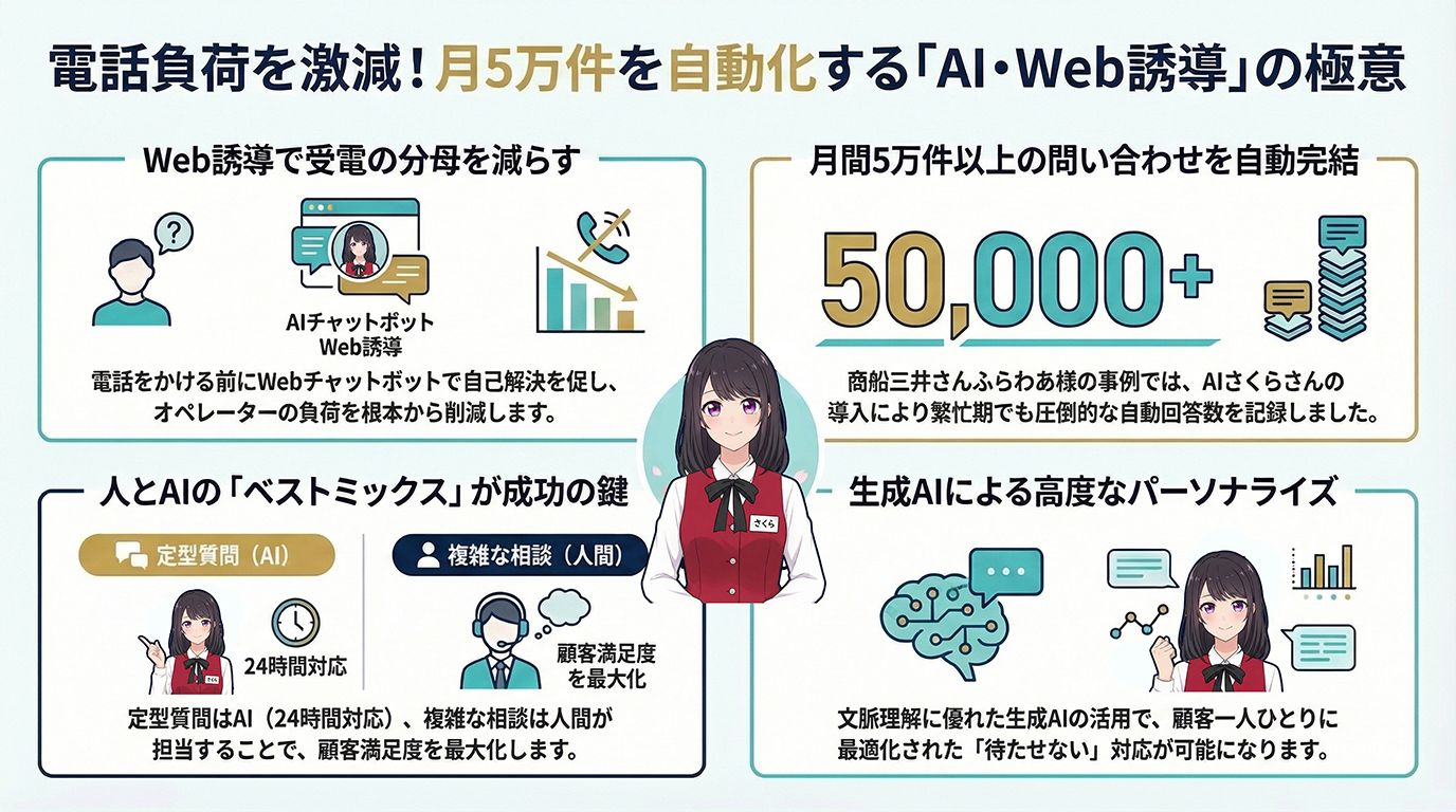 Q1:電話を減らすには、まずボイスボット(自動電話応答)が必要ですか?A1:いいえ、必ずしも電話を直接AIで取る必要はありません。商船三井さんふらわあ様の事例のように、Webサイト上のチャットボット(AIさくらさん等)を強化し、電話をかける前に解決させる「Web誘導」が、受電件数を減らすための極めて有効な第一歩となります。