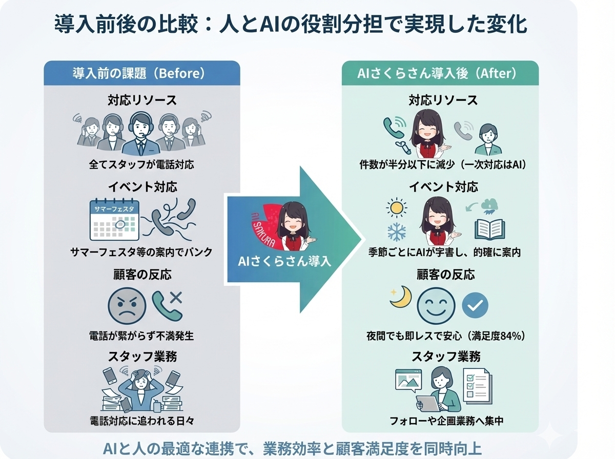 AI導入の真の価値は、単に電話を減らすことではなく、スタッフが「心の通うおもてなし」に使える時間(月1200分)を取り戻すことにあります。「解決率84%」の実績を持ち、季節ごとのイベント対応まで学習できる『AIさくらさん』で、あなたの現場もDXしませんか?