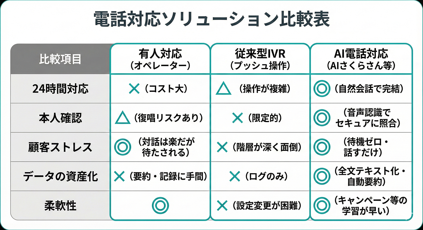 「AIさくらさん」に代表される最新のAI電話対応は、単なる自動応答ではありません。従来型のIVR(プッシュ操作)や有人対応と比較した場合、金融機関にとって以下の決定的なメリットがあります。