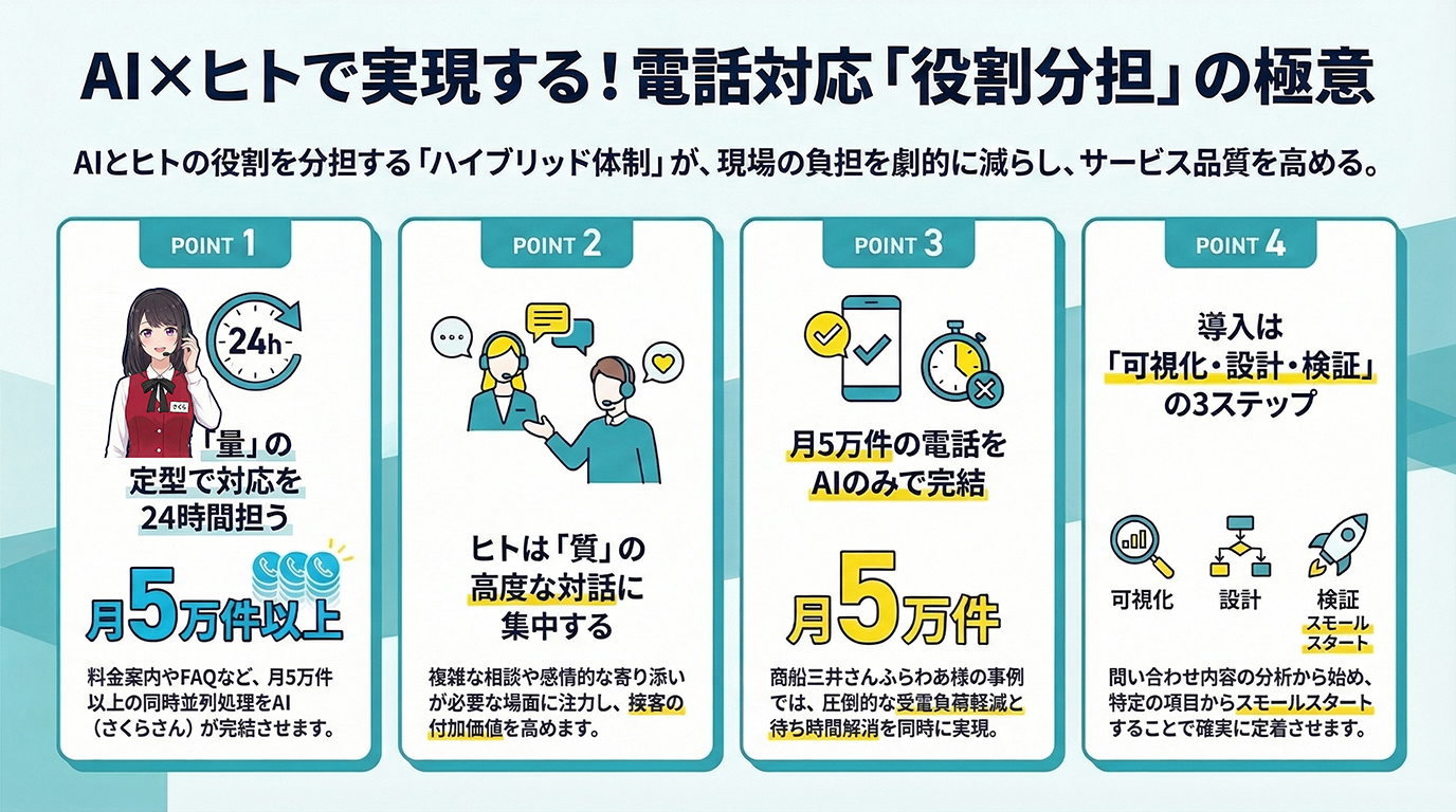 AI導入を成功させる鍵は、すべての対応をAIに任せようとせず、AIが得意な「量」の処理と、人間が得意な「質」の対応を明確に切り分けることにあります。