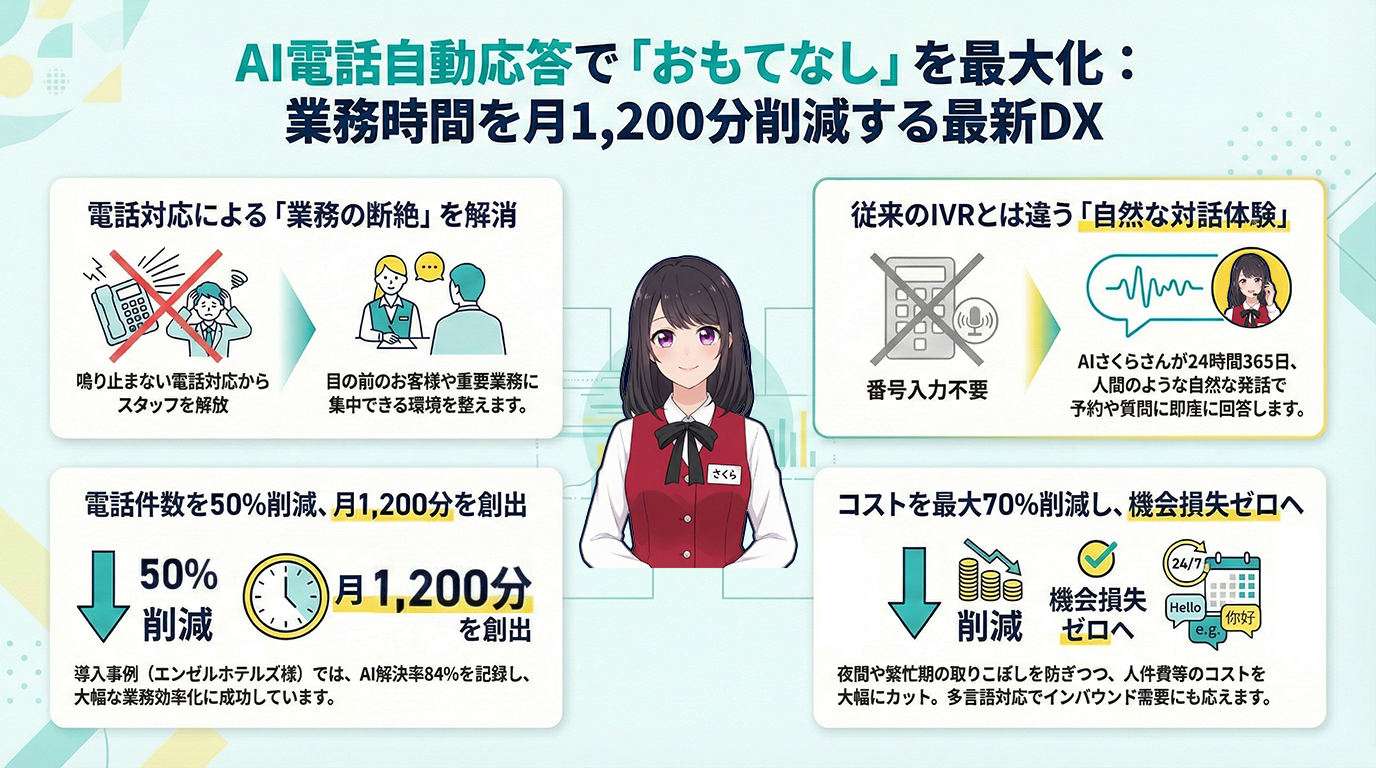 実際にAI電話自動応答システム「AIさくらさん」を導入したエンゼルホテルズ様では、大きな成果が出ています。