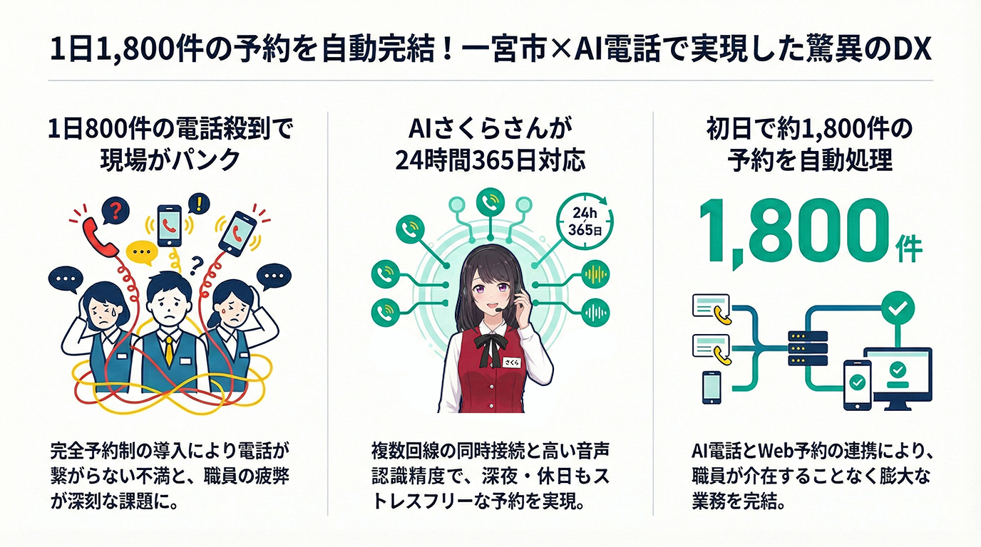 「職員だけでは到底対応しきれない」という切迫した状況。回線は常に塞がり、市民は電話が繋がらない不満を抱え、職員は鳴り止まないベルの音に追われる日々。この「予約のための電話対応」というアナログな障壁が、行政サービスの質を揺るがす大きな課題となっていました。