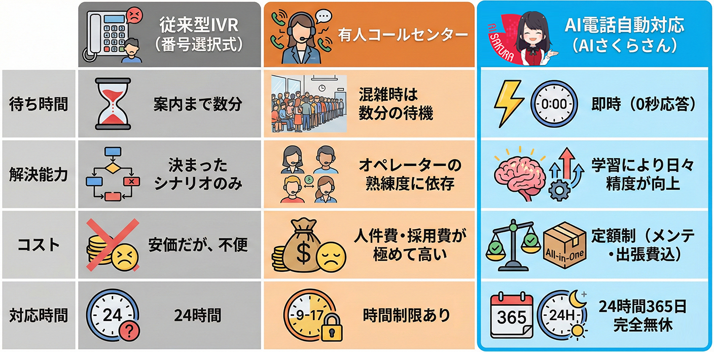 なぜ「AIさくらさん」が選ばれるのか、従来の手法と比較しました。