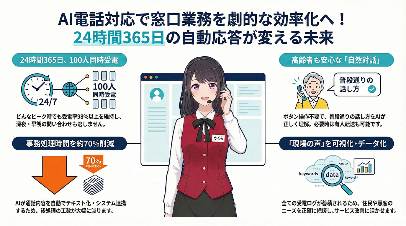 AIによる電話自動対応は、利用者を待たせず、現場を単純作業から解放するための「窓口の守護神」です。人手不足が加速し、サービスの質が問われる今、テクノロジーによる効率化は持続可能な運営において避けて通れない一歩となります。