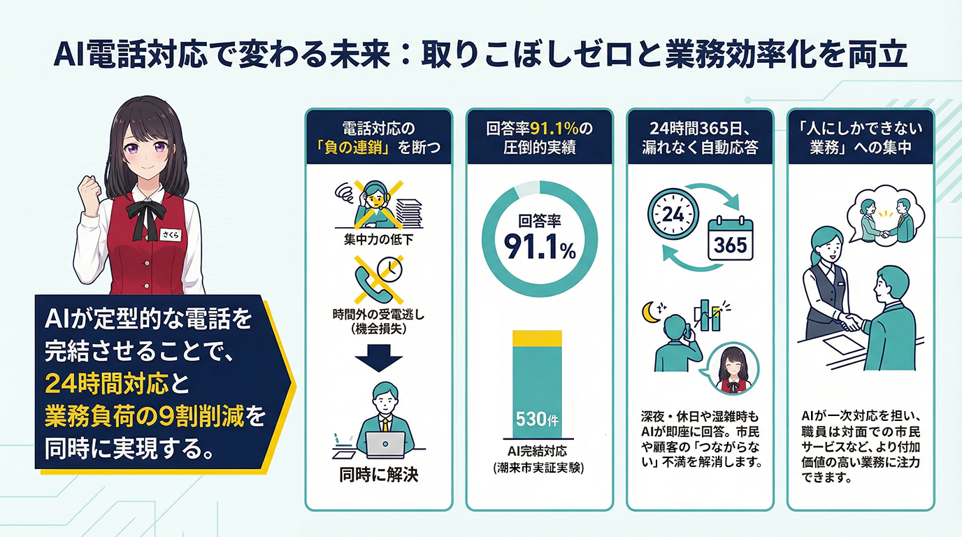 電話は顧客や市民との最も直接的な接点です。そこを「つながらない状態」のまま放置することは、組織としての信頼を損なうリスクを孕んでいます。