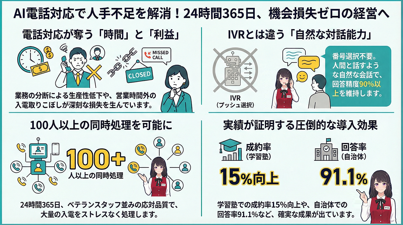 AI電話対応は、単なる効率化ツールではありません。スタッフを単純作業から解放し、組織全体のパフォーマンスを最大化させるための投資です。電話1本への対応の差が、数年後の企業の評判と経営数字を大きく左右します。