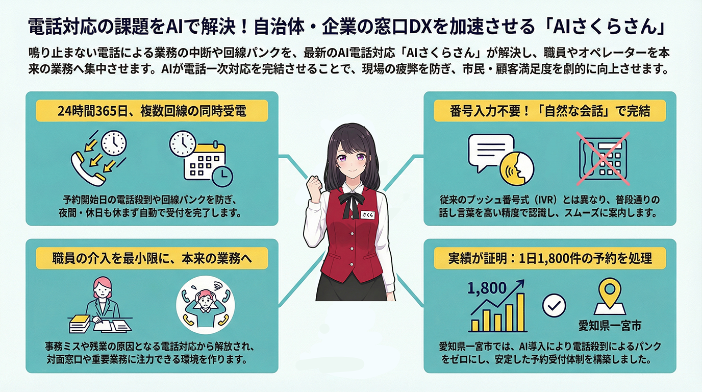AI電話対応は単なる自動化ツールではなく、現場を「電話対応」というストレスから解放し、本来向き合うべき業務に注力させるための「戦略的パートナー」です。自治体・企業を問わず、最新テクノロジーを適切に配置することで、「誰も待たせない、誰も取りこぼさない」次世代の窓口サービスを実現しましょう。