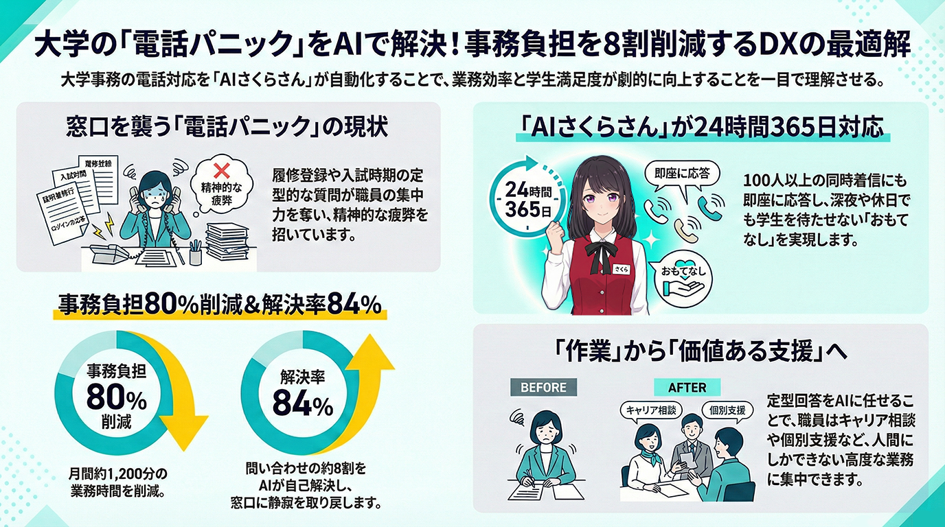 大学のAI電話対応を導入すれば、定型質問の8割を自動応答で完結させ、繁忙期における職員の業務負担を劇的に軽減することが可能です。