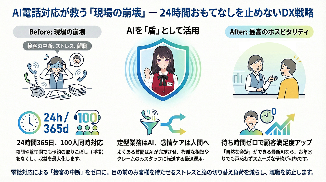 AI電話対応は、単なる効率化ツールではありません。現場スタッフの心を守り、お客様へのホスピタリティを最大化するための「インフラ」です。24時間・待ち時間ゼロの対応は、競合他社との強力な差別化要因になります。