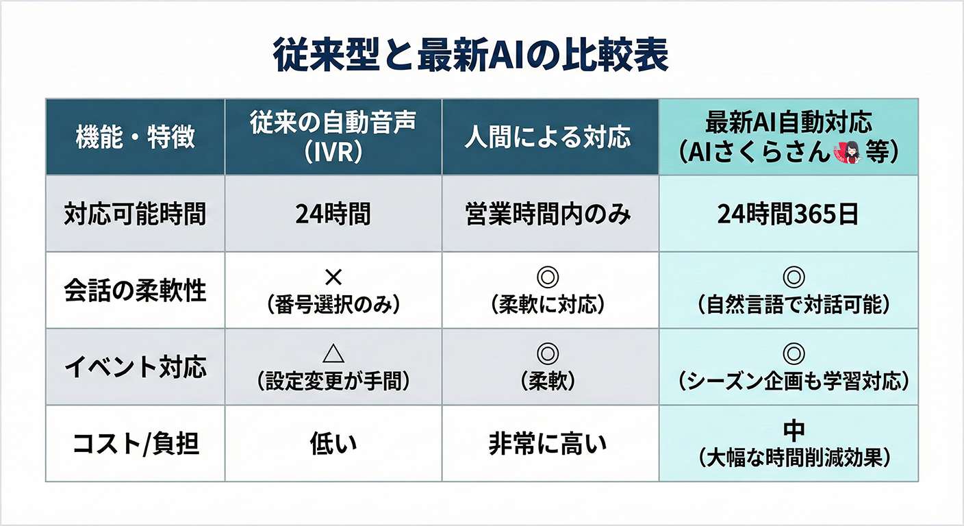 従来の「自動音声応答装置(IVR)」と、最新の「AI電話自動対応」は全く異なる技術です。