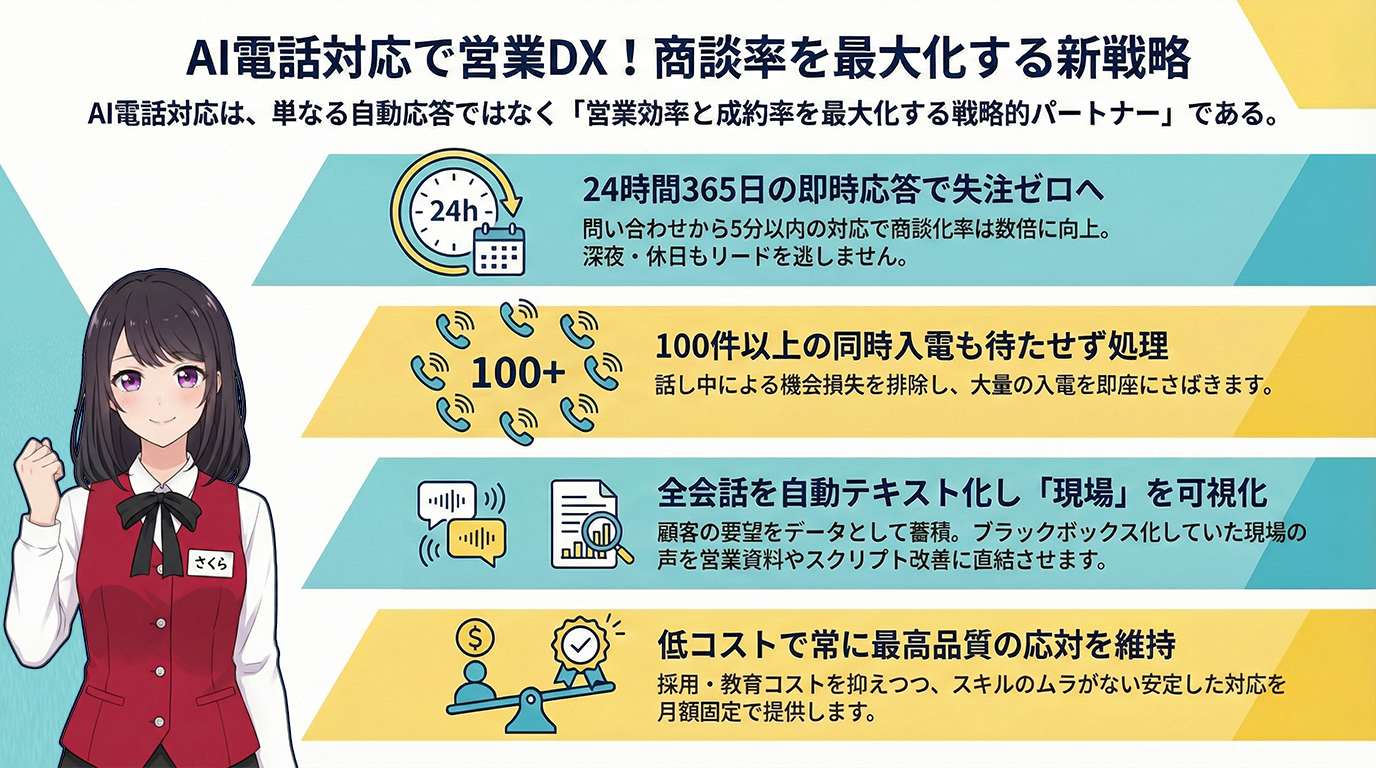 AI電話対応は、即時対応による失注防止と現場の声の可視化を実現し、営業戦略を最適化する基盤です。