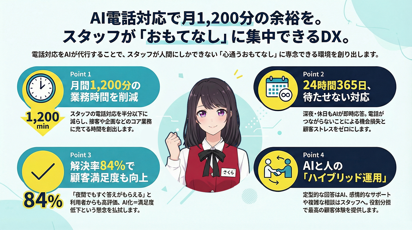 エンゼルホテルズ様の今後の展望にもあるように、「必要な場合のみスタッフに転送される仕組み」を構築することが、効率と満足度を両立させる最適解です。