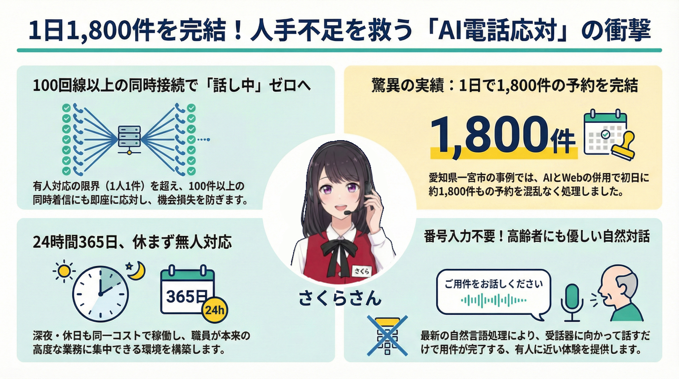 愛知県一宮市の事例は、AI電話対応がいかに強力な「労働力」になるかを象徴しています。令和6年度の市民税・県民税等の申告受付において、AIさくらさんを導入したことで驚異的な成果を記録しました。