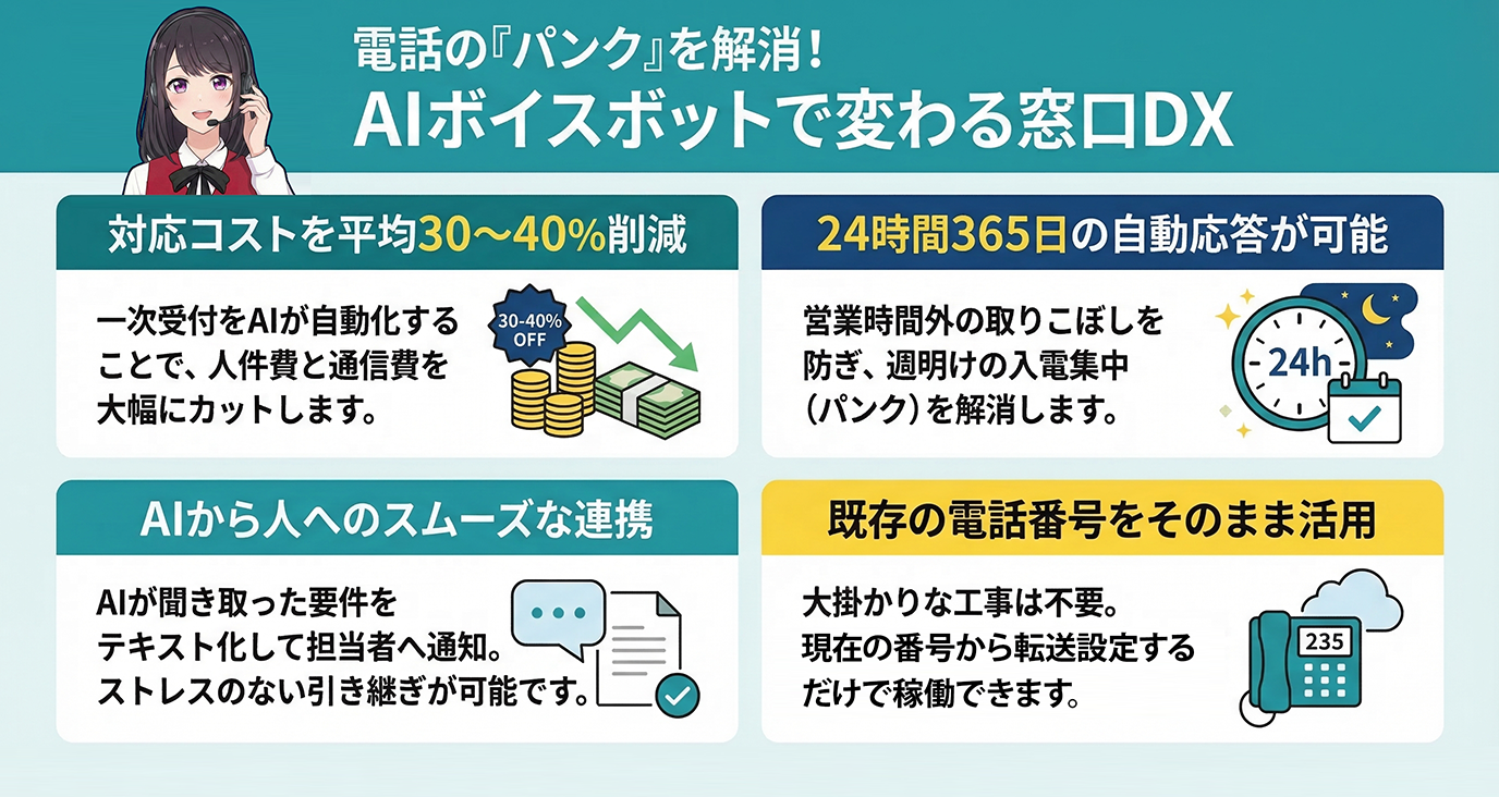 筆者が独自に集計したボイスボット導入企業データ(最新版)によると、導入前後で平均30〜40%の電話対応コスト(人件費および通信費)の削減が確認されています。人手による対応からAIへと切り替えることで、具体的に以下のような変化が生まれます。