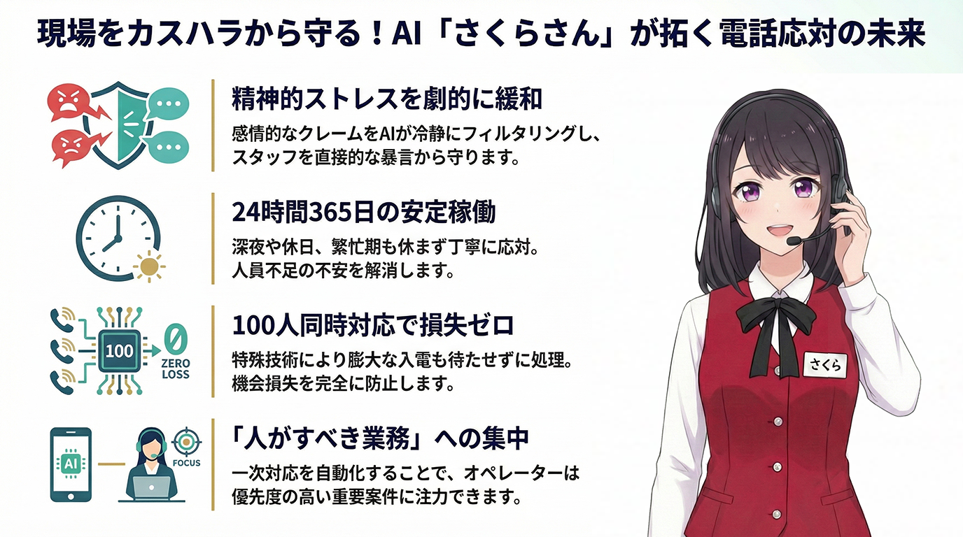 AIスタッフ「さくらさん」は、24時間365日、人間のような柔軟な対話で電話対応を代行します。最大のメリットは、感情を持たないAIが一次対応を担うことで、スタッフが直接的な暴言にさらされるリスクを物理的に遮断できる点にあります。
