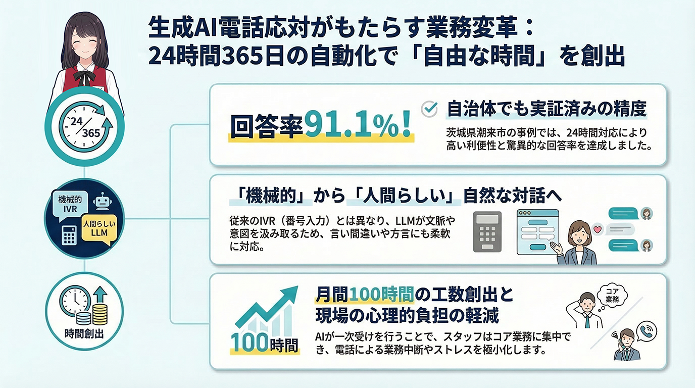生成AIによる電話自動応答は、単なるトレンドではなく、現場を「電話の呼び出し音」という物理的な拘束から解放し、本来のコア業務に集中するための実務的な解決策です。