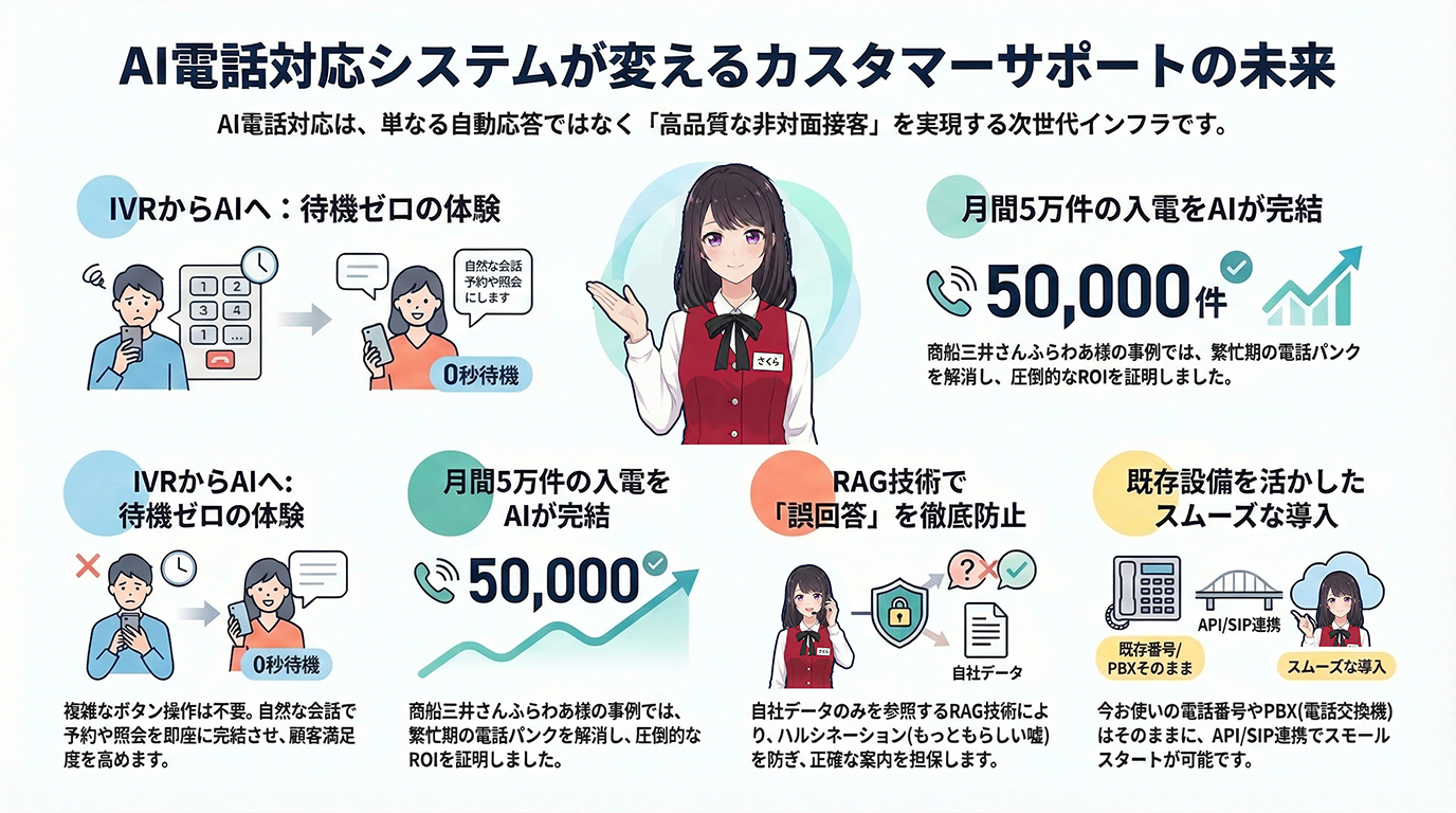 AI電話対応システムは、技術的な信頼性(RAG/ファインチューニング)と、既存インフラとの親和性を両立させる段階に来ています。