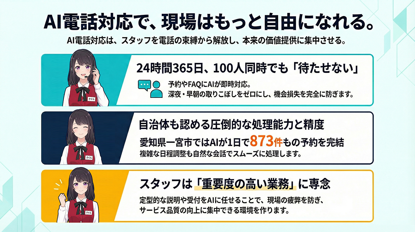 最新のAI電話対応ソリューション(例:AIさくらさん)は、こうした現場のジレンマを解消します。単なる自動応答ではなく、音声認識と自然言語処理によって、人間と会話しているようなスムーズな予約受付を可能にします。