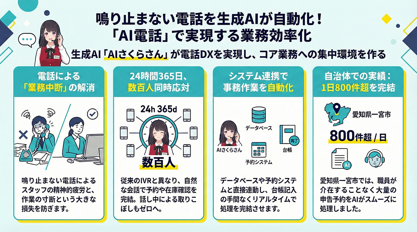 AI電話の信頼性を裏付けるのが、愛知県一宮市での「AIさくらさん」導入事例です。公共性の高い「自治体窓口」という、極めて高い正確性が求められる現場で圧倒的な成果を出しています。