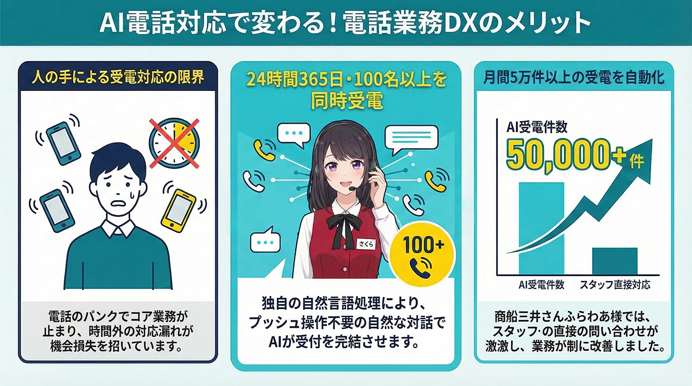人的リソースに頼る受電対応が引き起こす、組織の深刻な3つの課題を浮き彫りにします。