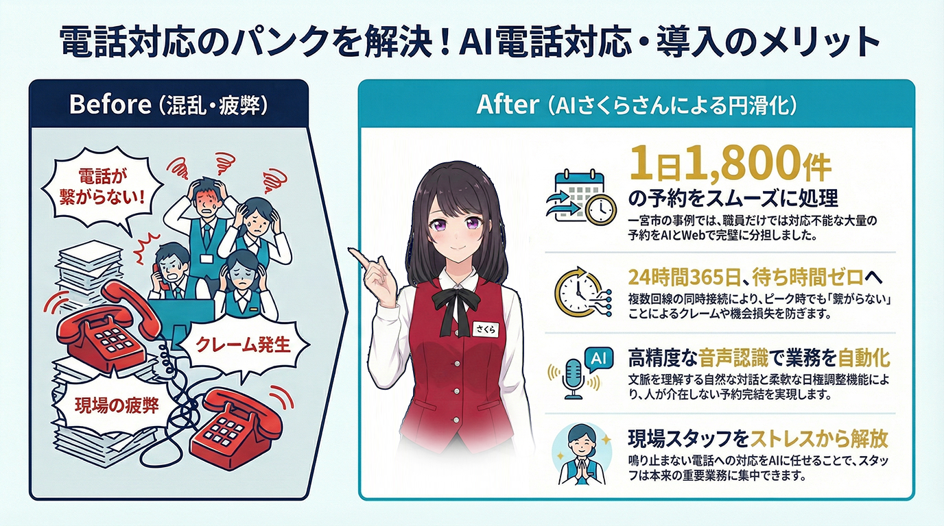 ここでは、自治体の窓口業務においてAI電話対応システム(AIさくらさん)を導入し、予約受付業務のパンクを回避した愛知県一宮市の事例をご紹介します(※提供元の導入事例より)。