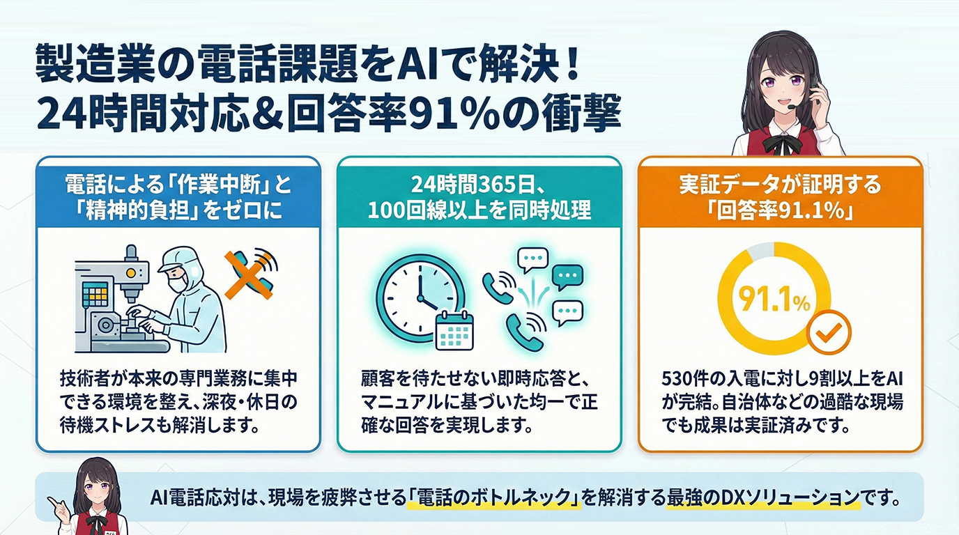AI電話応対は、受電を自動化し、24時間365日の技術サポートと大幅な工数削減を両立する製造業向けDXソリューションです。