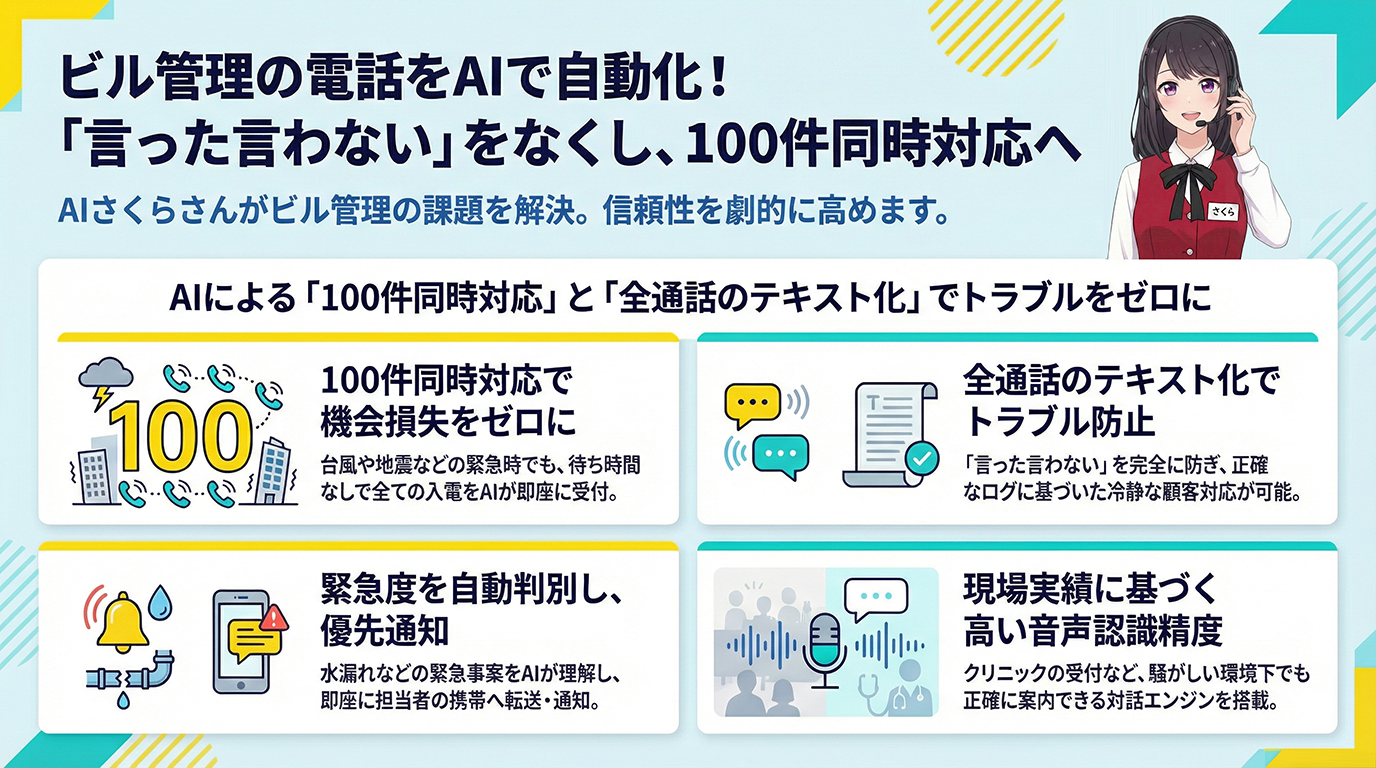AIさくらさん:「お電話ありがとうございます。〇〇ビル管理センター、AI担当のさくらです。どのようなご用件でしょうか?」
