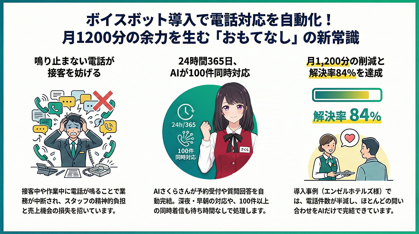 実際に、ボイスボット(AIさくらさん)を導入した「エンゼルホテルズ様」も、導入前は同様の課題を抱えていました。
