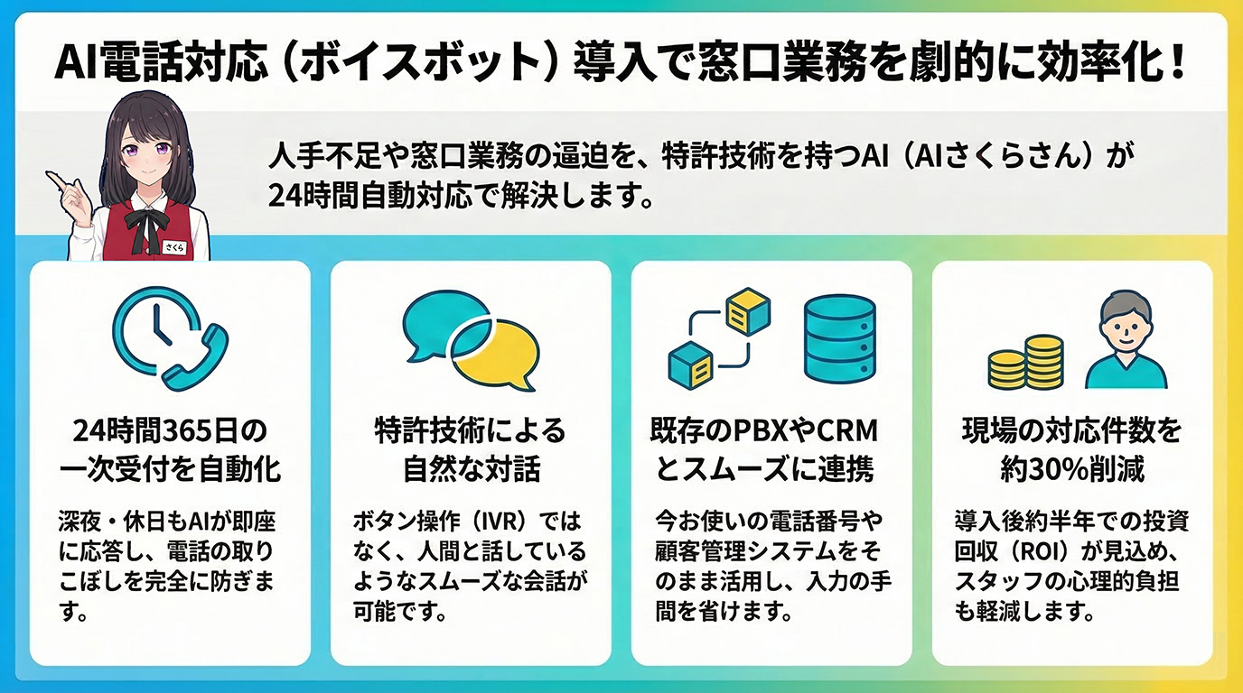 日々全国から膨大な問い合わせが寄せられる同社では、オペレーターの対応件数の限界から、お客様をお待たせしてしまうケースが課題でした。そこで、業務効率化と顧客満足度の両立を目指し、柔軟な対話が可能な当社のAIシステム(AIさくらさん)を一次受付として導入しました。