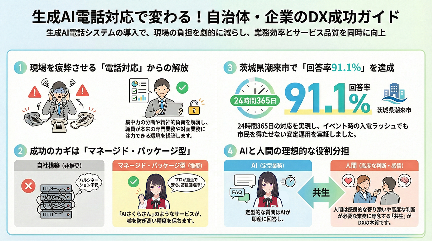 生成AI電話対応は、現場の負担を劇的に軽減し、組織全体の「心の余裕」を生み出す強力な投資です。ツールの選定にあたっては、単なる価格比較だけでなく、潮来市のような高い回答率(91.1%)を実現するための「サポート力」を重視してください。