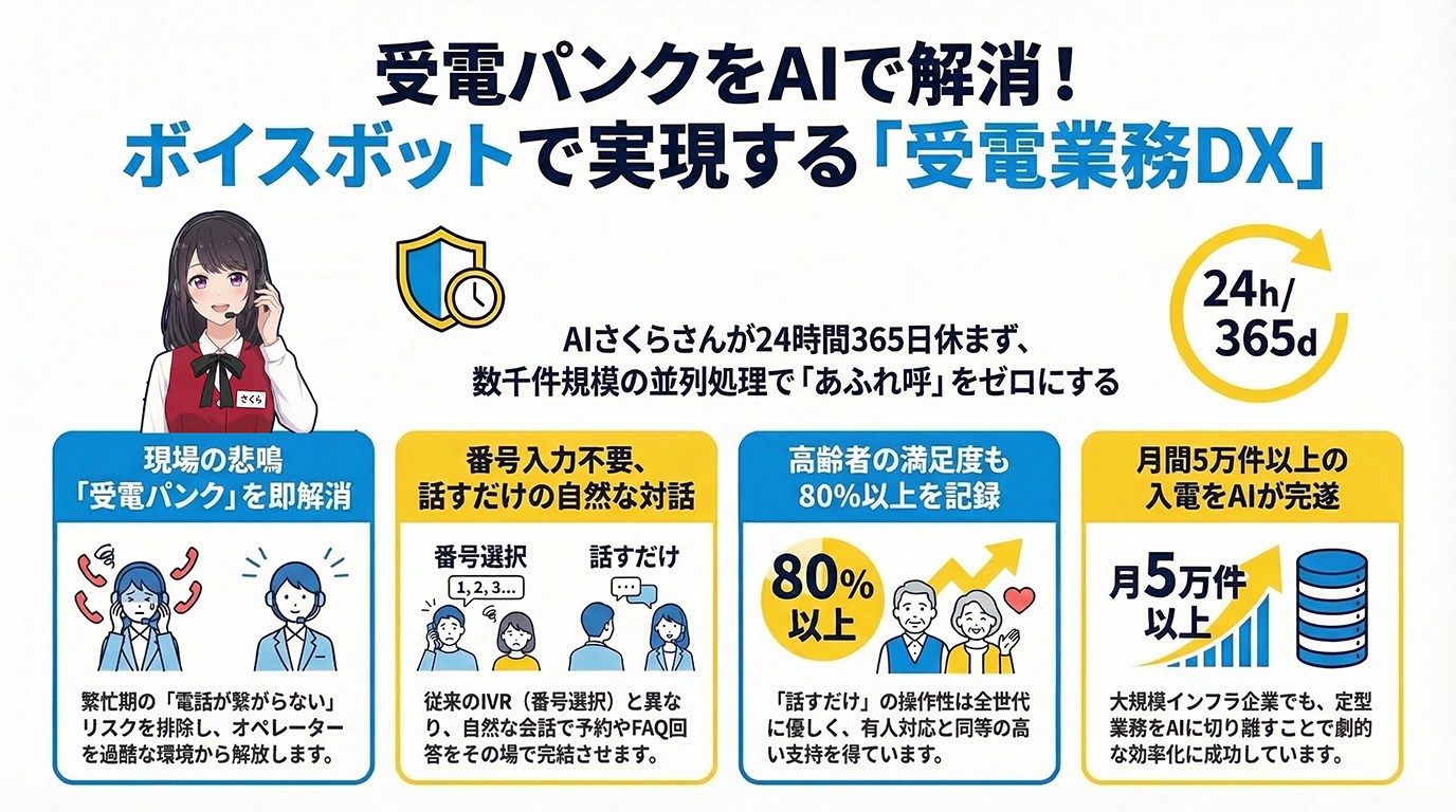 導入前の課題:電話がパンクする「繁忙期の恐怖」この企業様では、繁忙期にフリーダイヤルがパンクするほどの入電があり、オペレーターの負担は限界に達していました。そこで、交通インフラ等の「止まれない業界」で実績のあった「AIさくらさん」を採用し、受電DXへと踏み切りました。