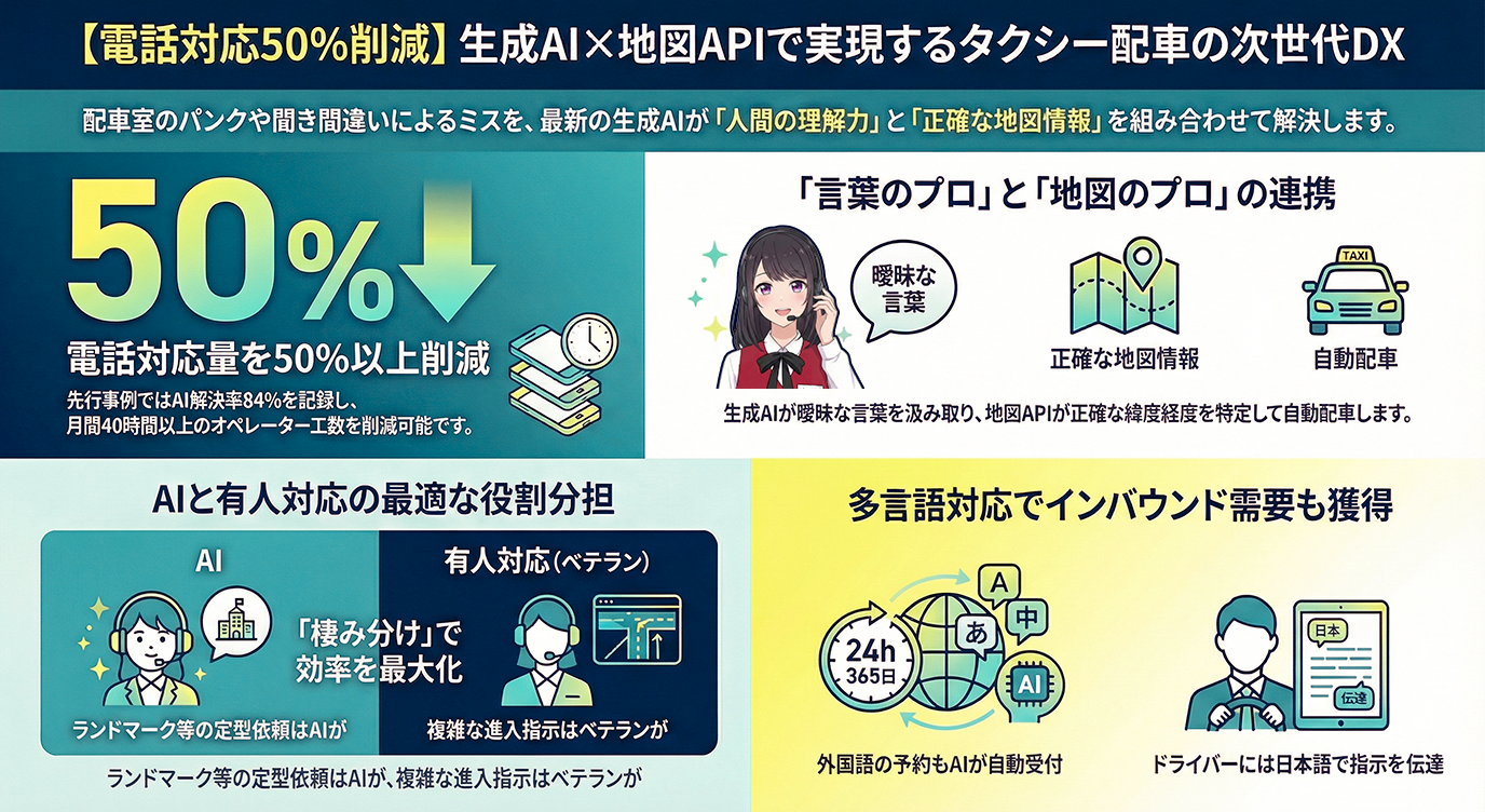 最新のAI電話対応システムは、生成AIの「意図理解」と地図APIの「位置特定」を組み合わせ、単純な配車依頼を自動化。有人対応コストを大幅に削減するDXソリューションです。