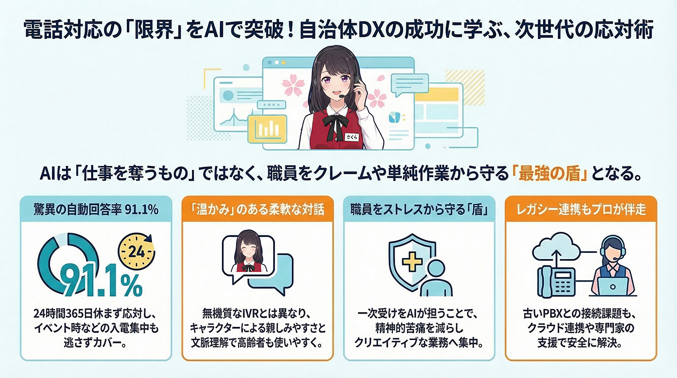 電話対応AIは、24時間対応による顧客満足度の向上と、現場の劇的な負担軽減を同時に実現します。潮来市の事例が示す通り、「90%以上の自動回答」はすでに手の届く現実です。