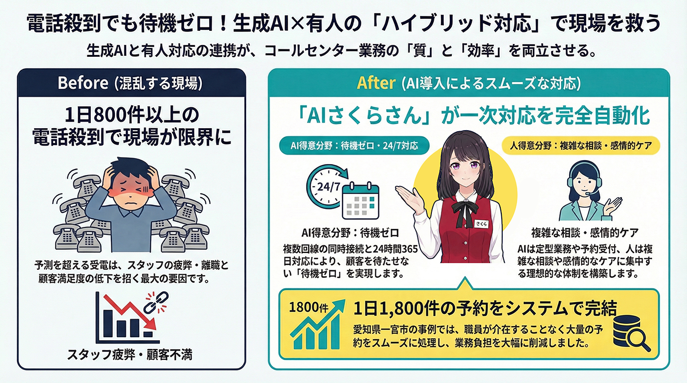 この課題を解決する鍵が、生成AIによる一次対応の完全自動化と、複雑な案件のみを有人窓口へ回す「ハイブリッド体制」の構築です。
